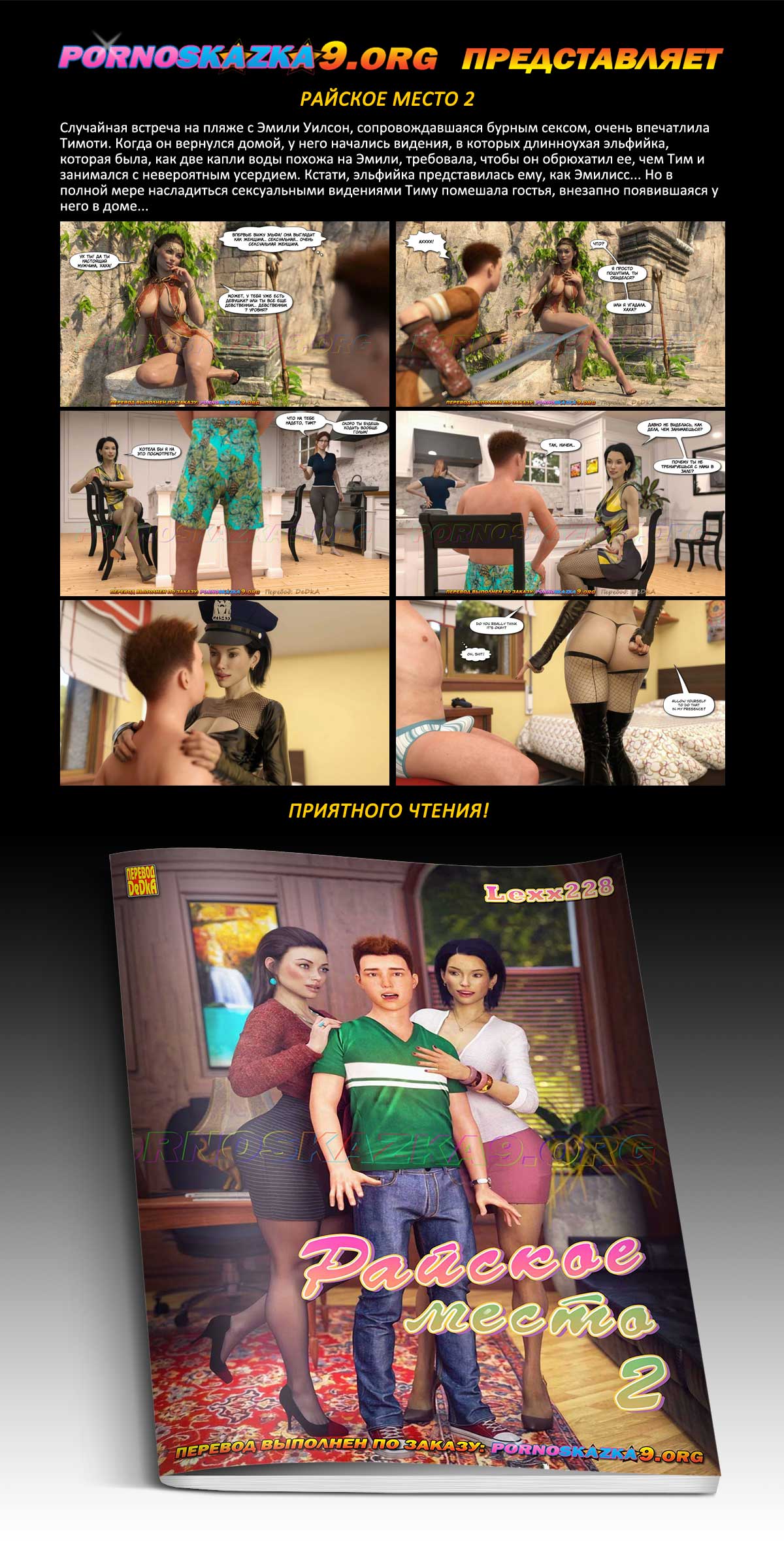 Порно комикс «Райское место. Часть 2.» Случайная встреча на пляже с Эмили Уилсон, сопровождавшаяся бурным сексом, очень впечатлила Тимоти. Когда он вернулся домой, у него начались видения, в которых длинноухая эльфийка, которая была, как две капли воды похожа на Эмили, требовала, чтобы он обрюхатил ее, чем Тим и занимался с невероятным усердием. Кстати, эльфийка представилась ему, как Эмилисс… Но в полной мере насладиться сексуальными видениями Тиму помешала гостья, внезапно появившаяся у него в доме…